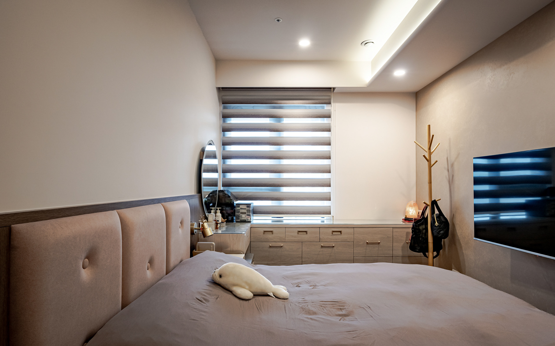 在這個坪數不大的小空間中,設計重點是同時保有美麗與實用,結合極致收納機能與年輕氛圍。我們巧妙地運用光條勾勒出舞台式的華麗效果,讓整體氛圍如同喝了一杯調酒般微醺柔和。