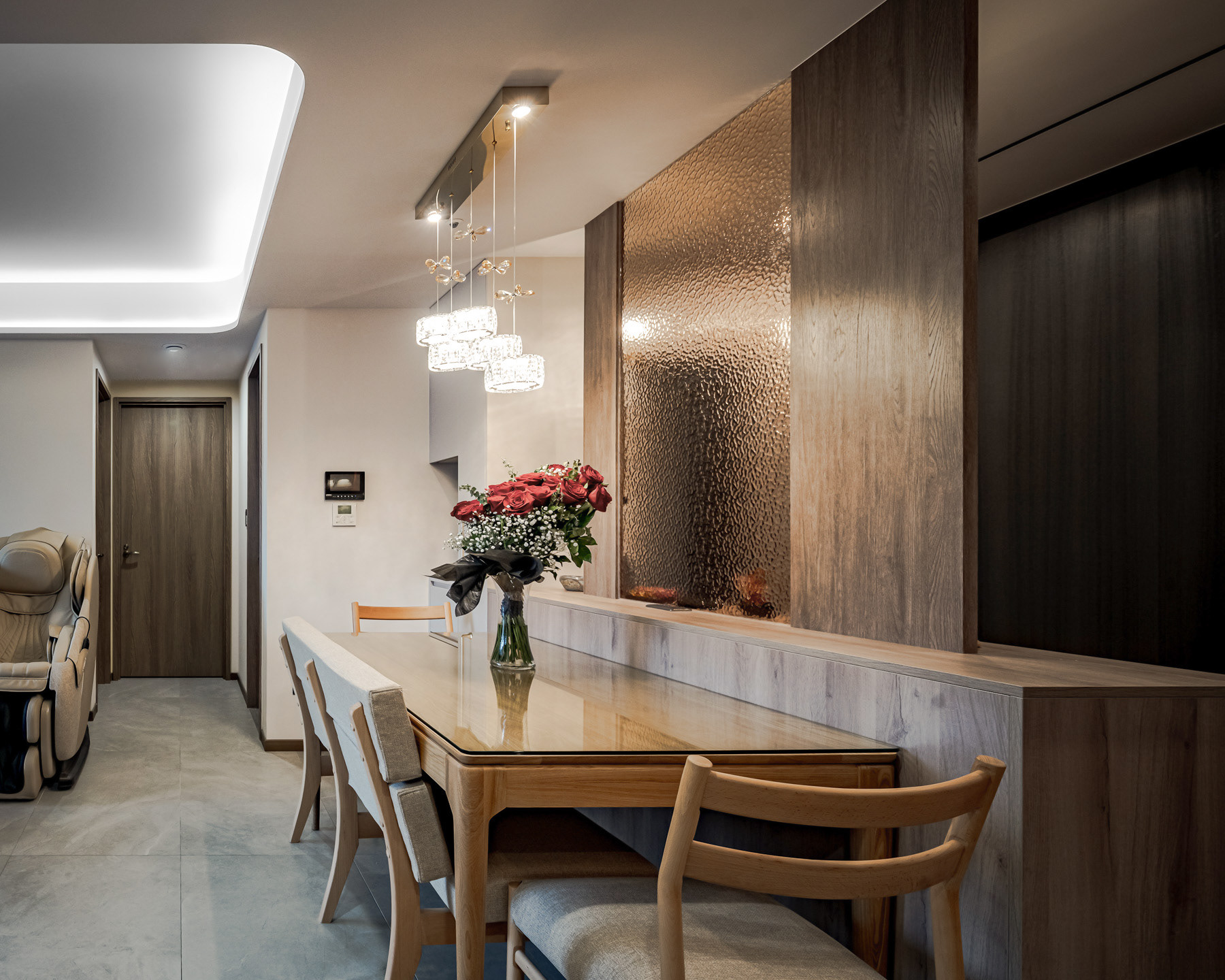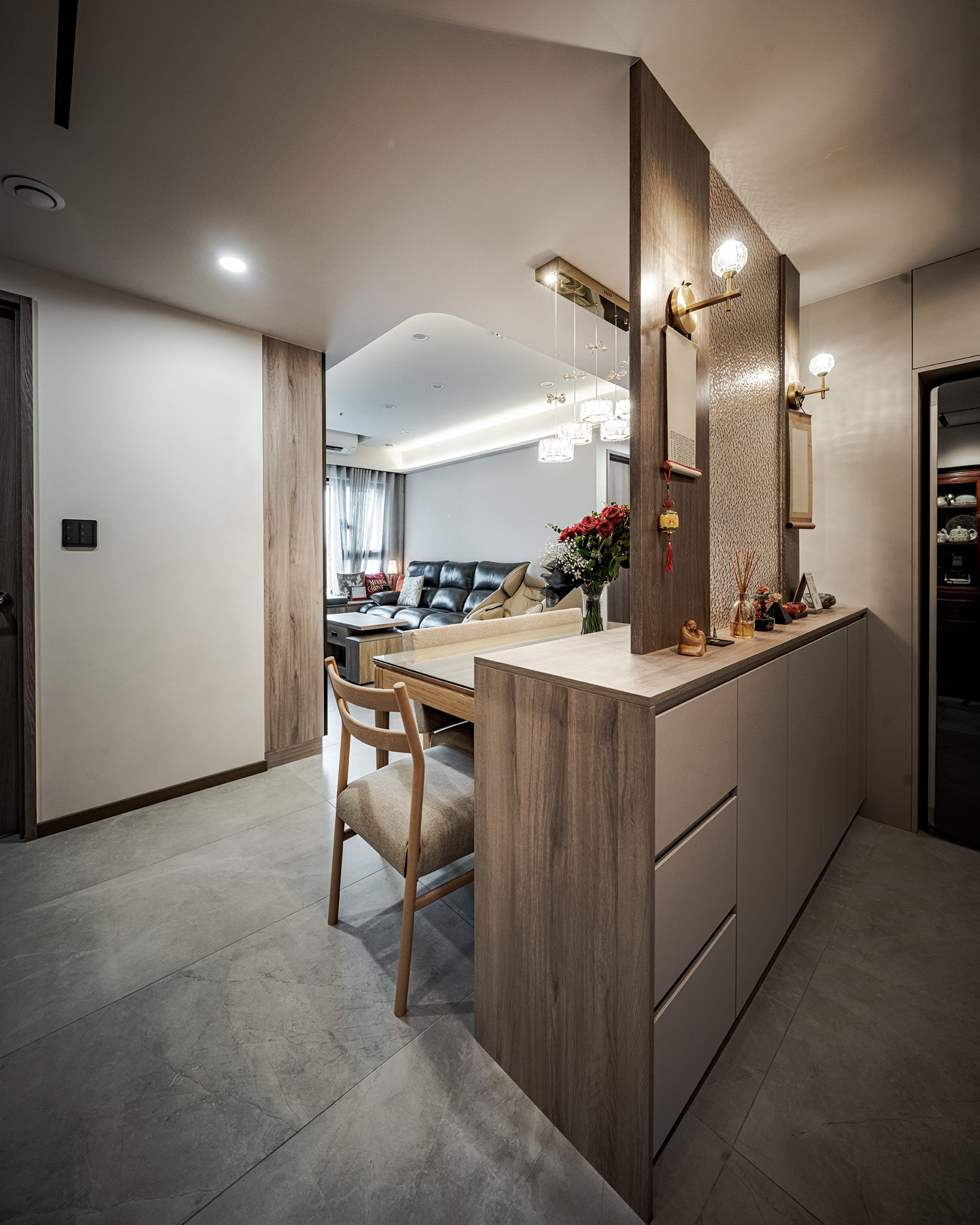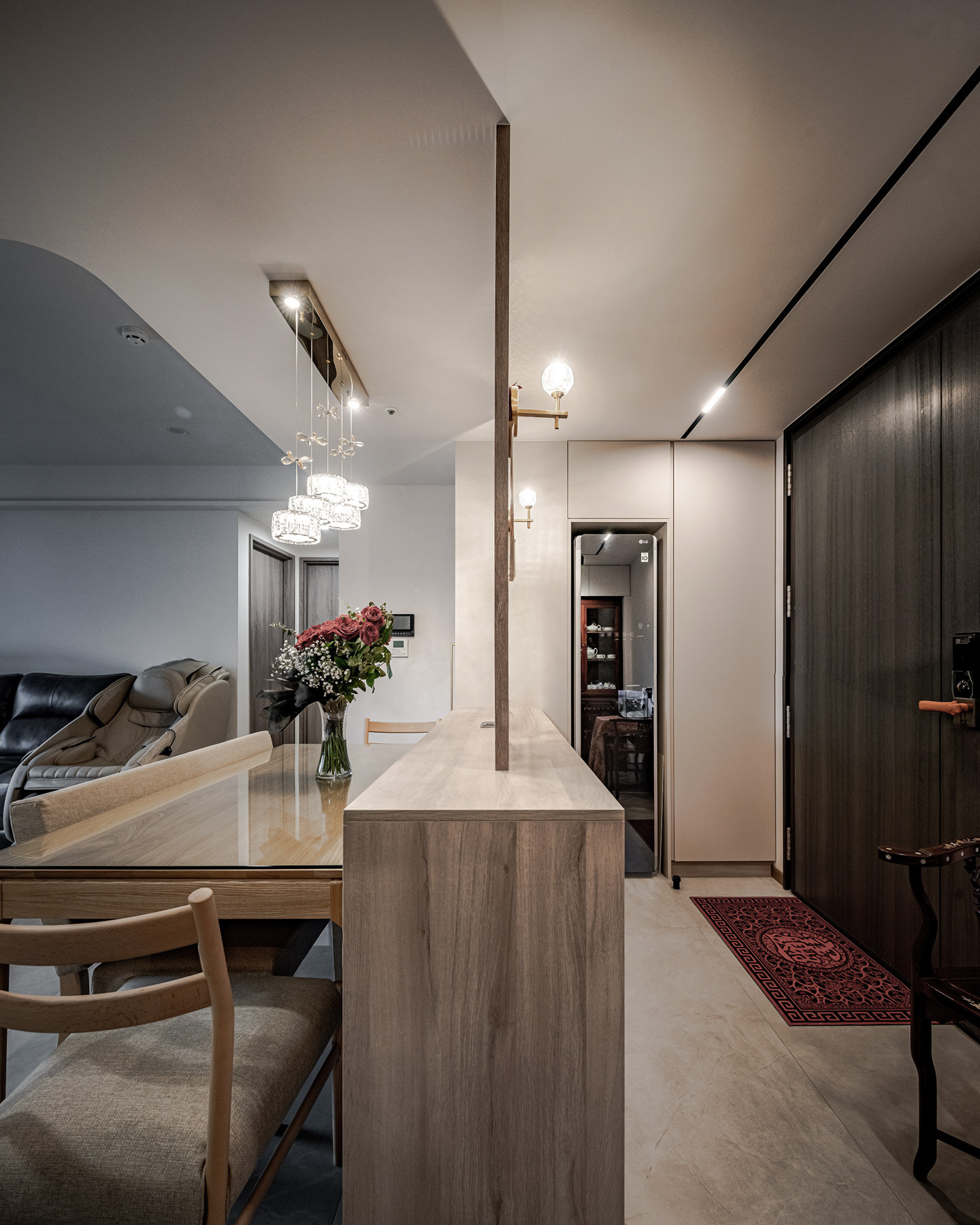 🏡 玄關區與客廳區分隔:透過玄關與餐廳的連結,我們設計的半高鞋櫃作為分隔,一邊為的進出門的置物平台,有效地創造出完整的落塵區。另一邊檯面為服務餐桌使用。屏風採用木質與玻璃,結合業主自選的燈飾,營造明亮而溫潤的用餐氛圍,讓空間在日常中呈現柔和且有韻律的節奏。