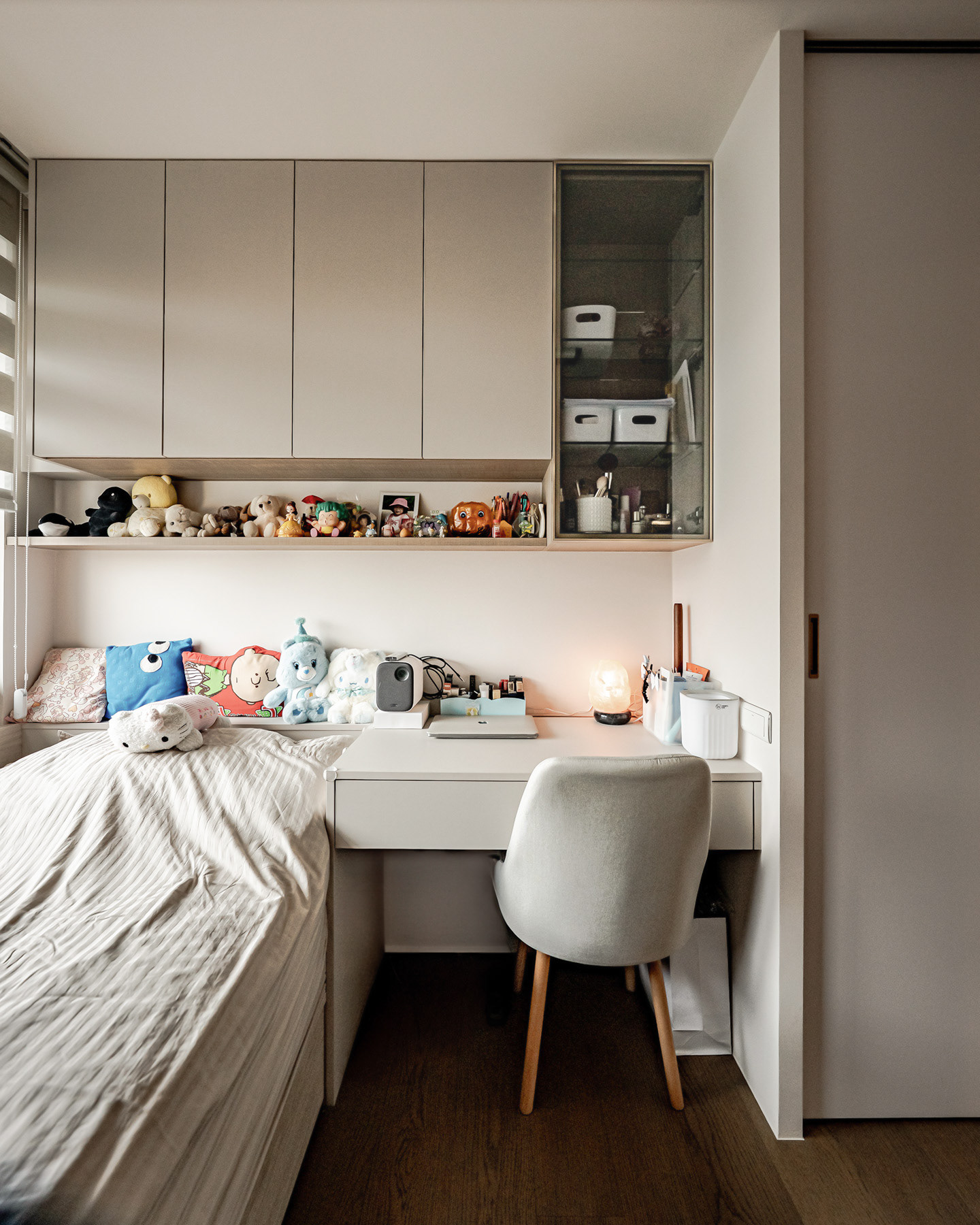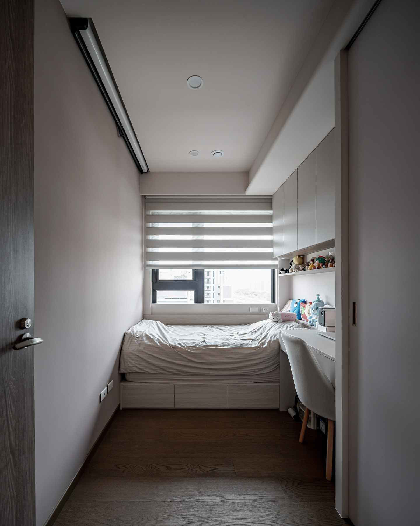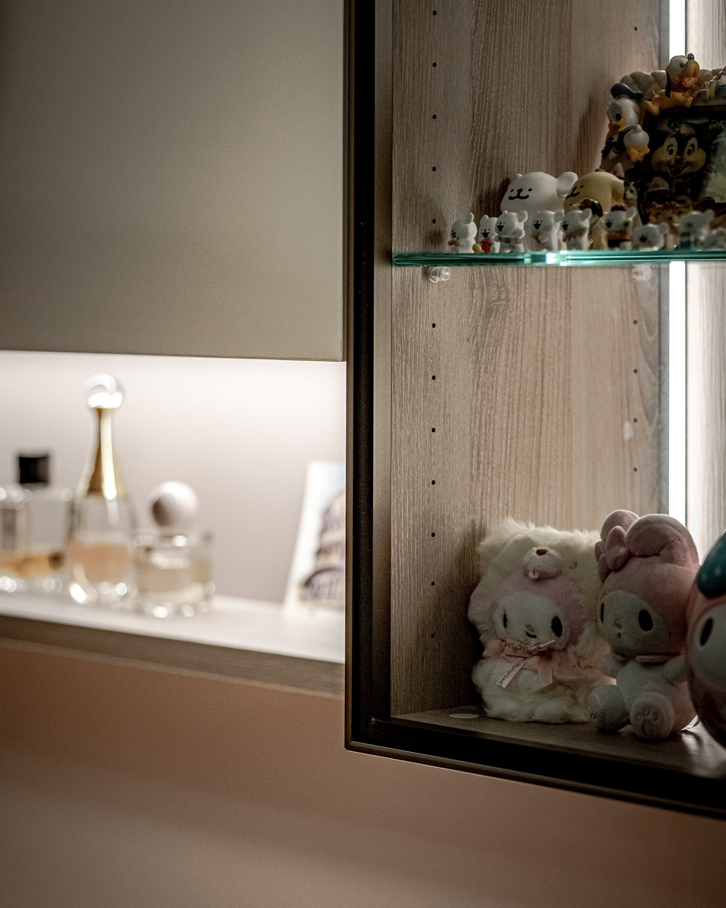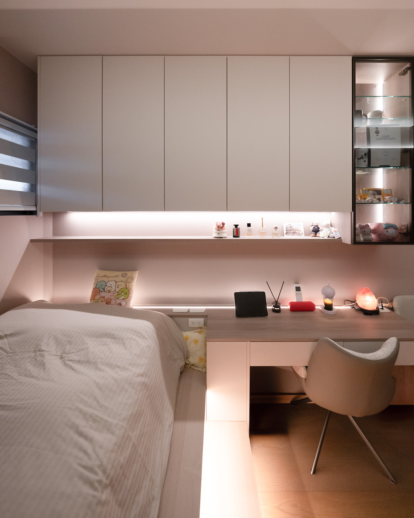 ❤️ 極致收納與清潔:為了實現美觀與實用兼具,採用滿牆面的櫃體及層板設計,創造海量收納。這種設計能有效地減少房內的邊邊角角,同時將視線高度規劃少部分的檯面及層板擺放玩物與香氛,讓這些區域能很輕鬆地清理灰塵,從根本上降低了整理的負擔。