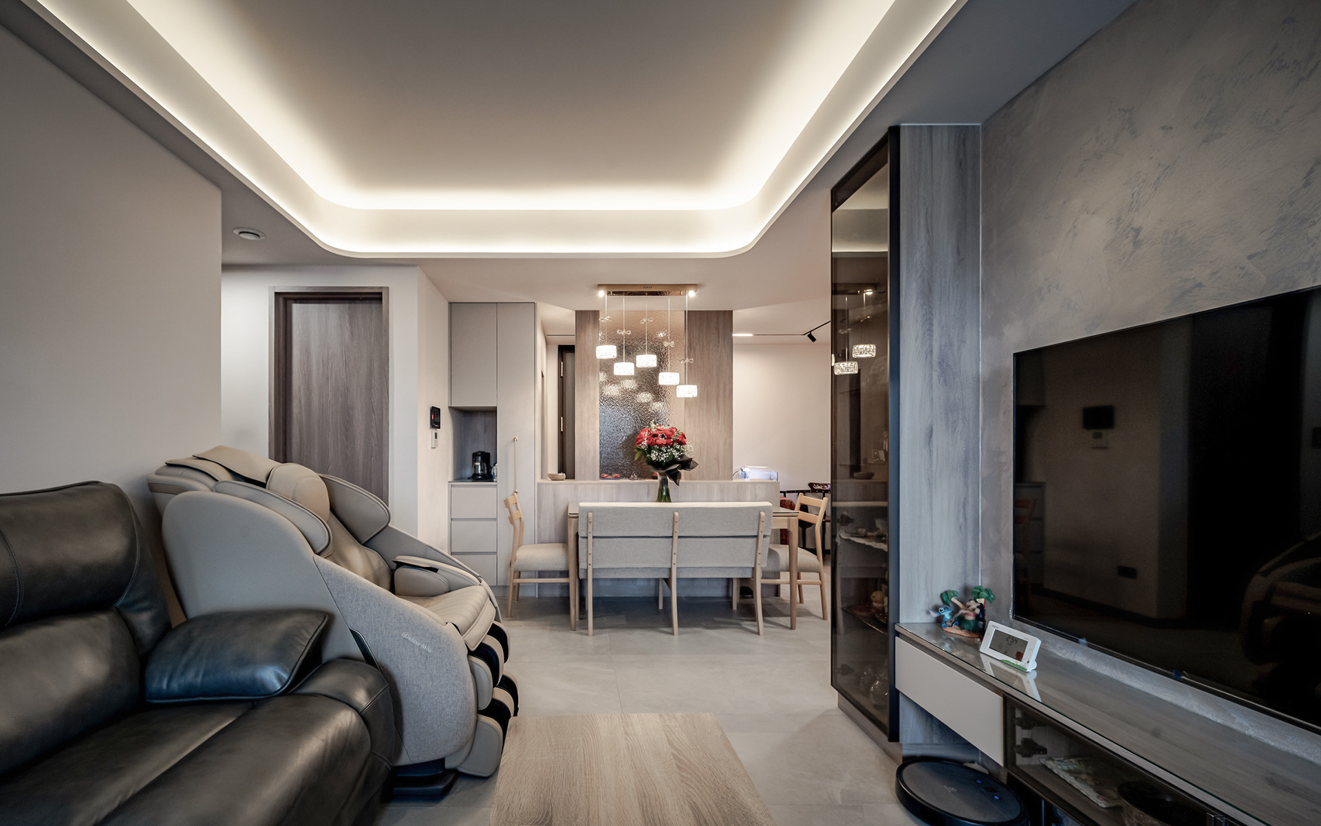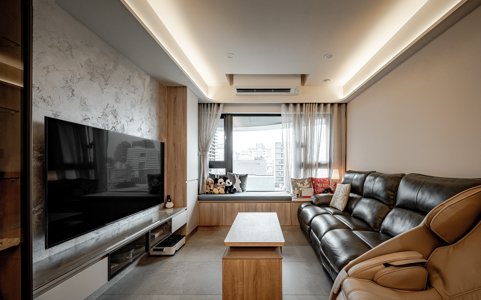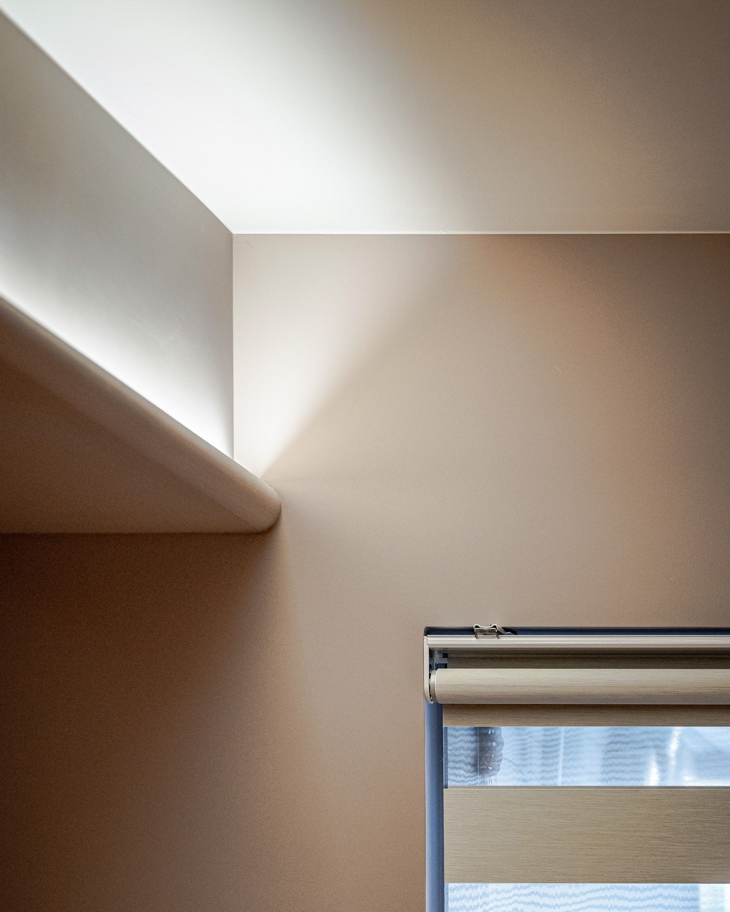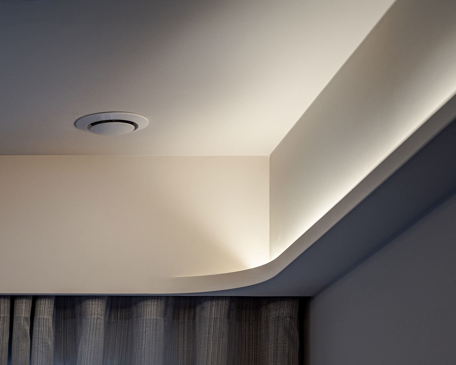 設計核心:消除銳利感,採用弧形導角曲面收邊造型設計。施工難度高於傳統直角,但能精準傳達美學目的:讓隱藏其中的間接燈光能夠均勻、柔和地擴散,避免光線生硬地切斷空間,為整個家帶來視覺上的包容性與舒緩的氛圍。