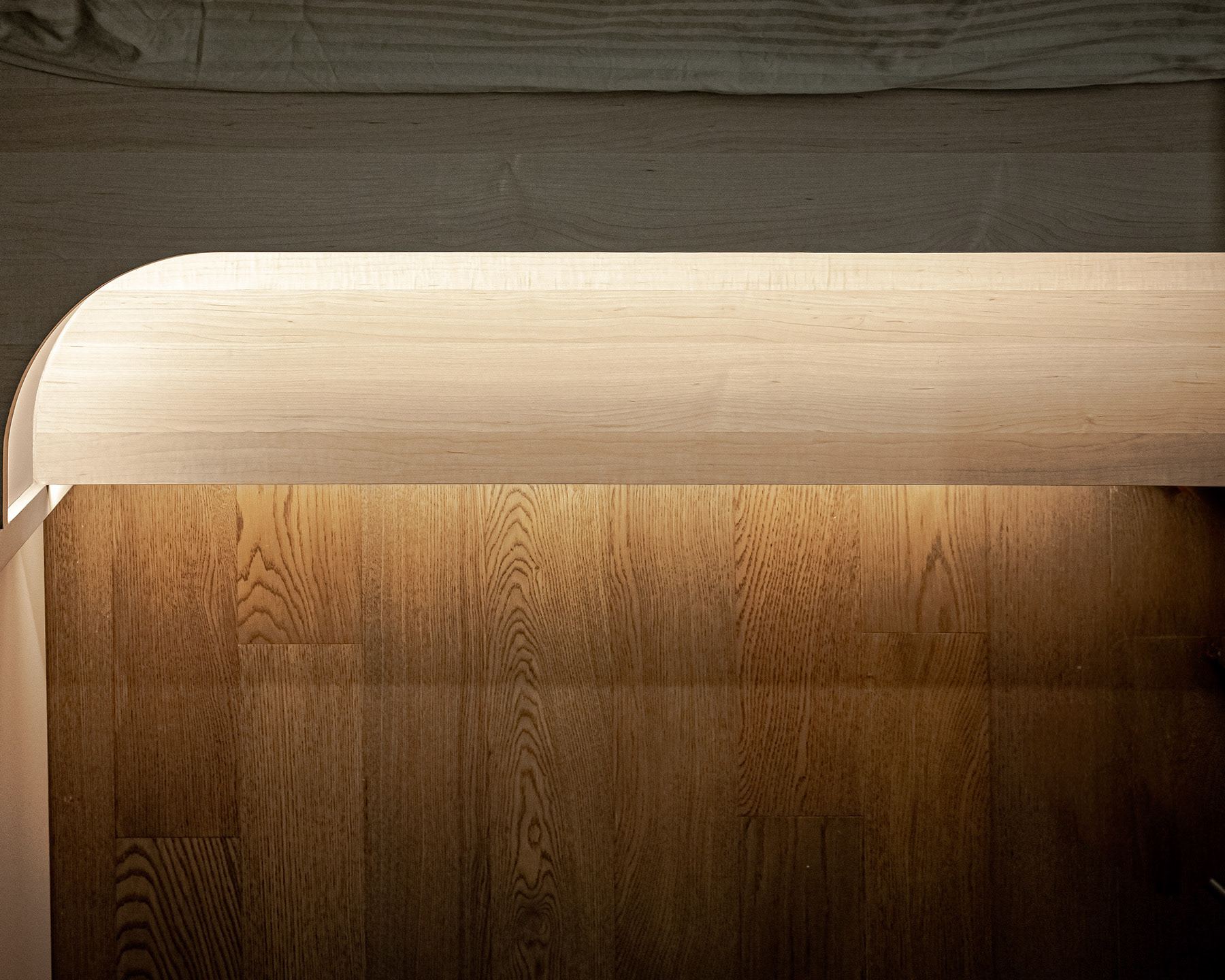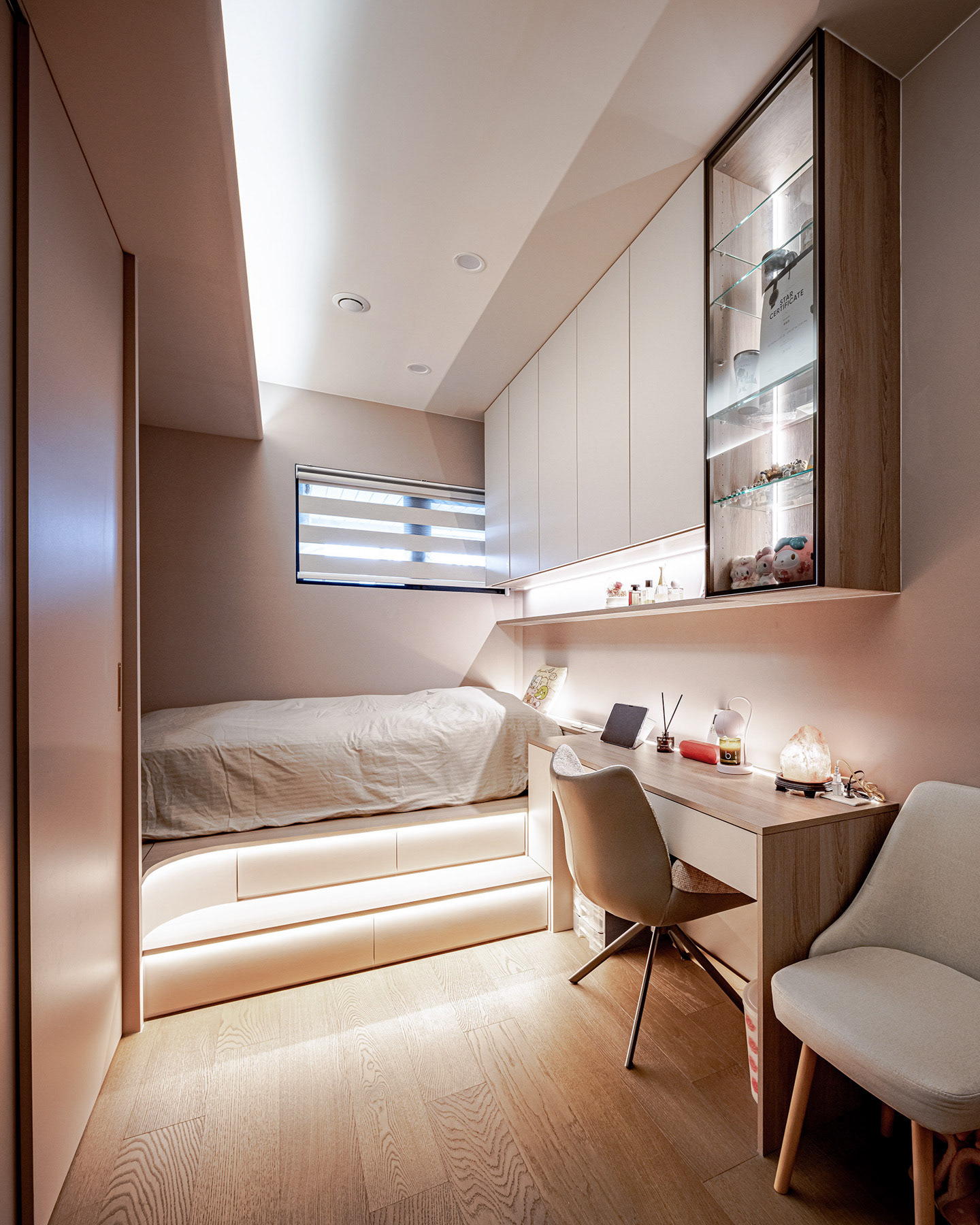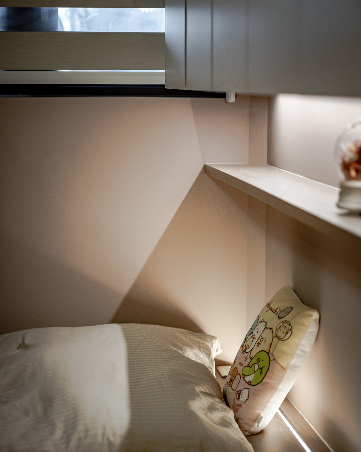 姊妹房的階梯式臥鋪,在機能上解決了小坪數的限制。在工藝上,我們堅持對每一個邊角進行圓弧導角處理。美觀的同時也提升夜間使用的安全性,讓床體結構呈現「懸浮感」,成功將機能性家具提升至藝術品級別。