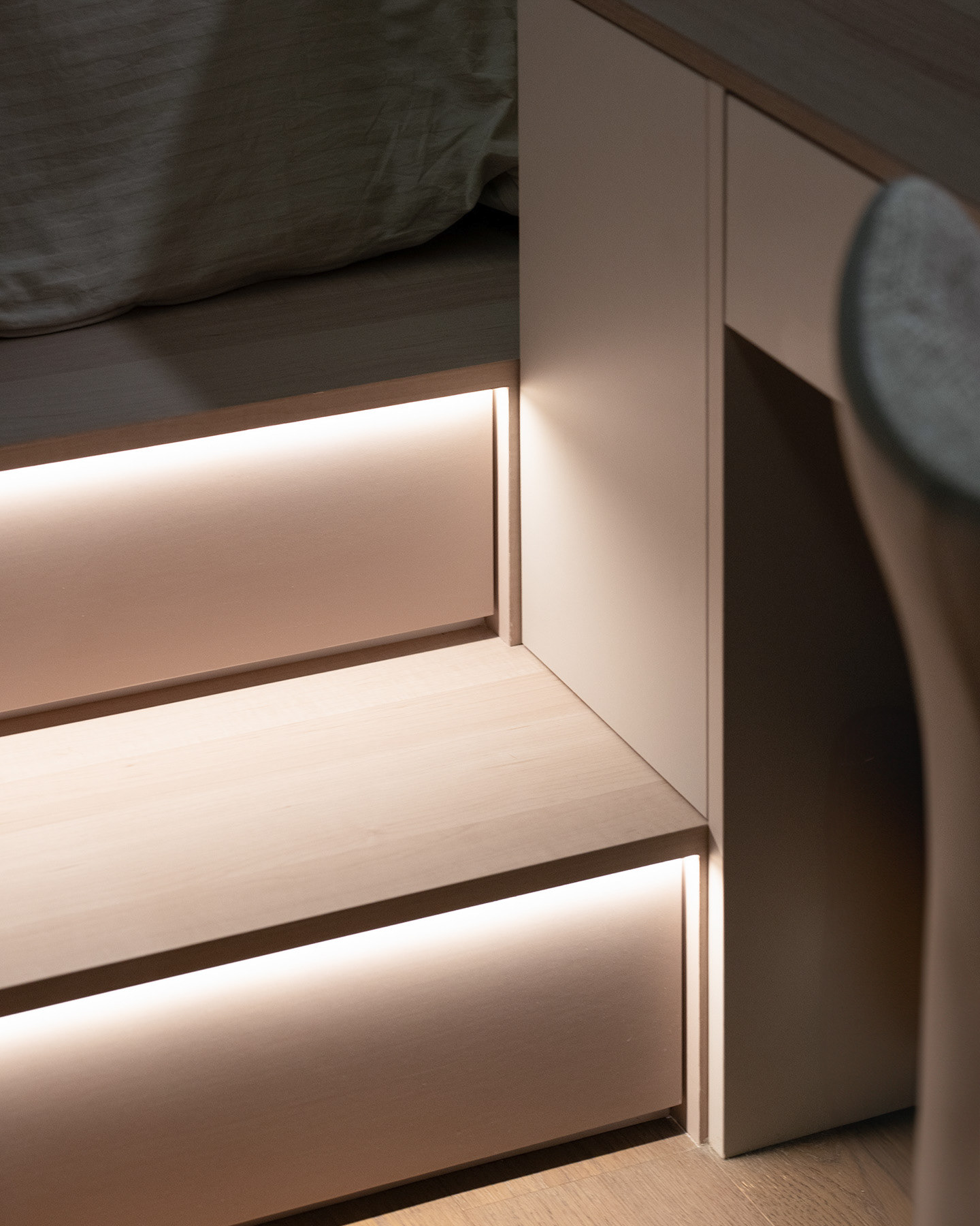 💡 夢幻與安全兼具:臥鋪下方的階梯燈光設計,除了氣氛營造也同時具備實質的機能性,有效提升夜間安全。柔和的間接光源更讓房間宛如舞台般絢麗,充滿專屬儀式感,讓歸家與休息都成為一種享受。