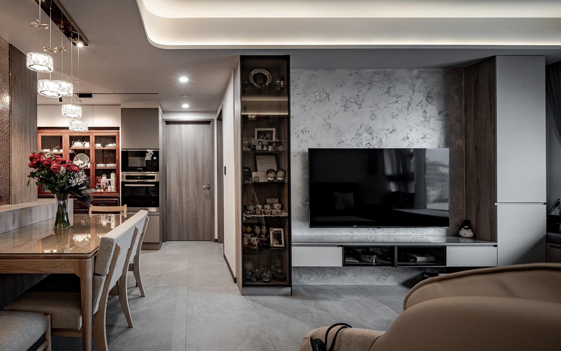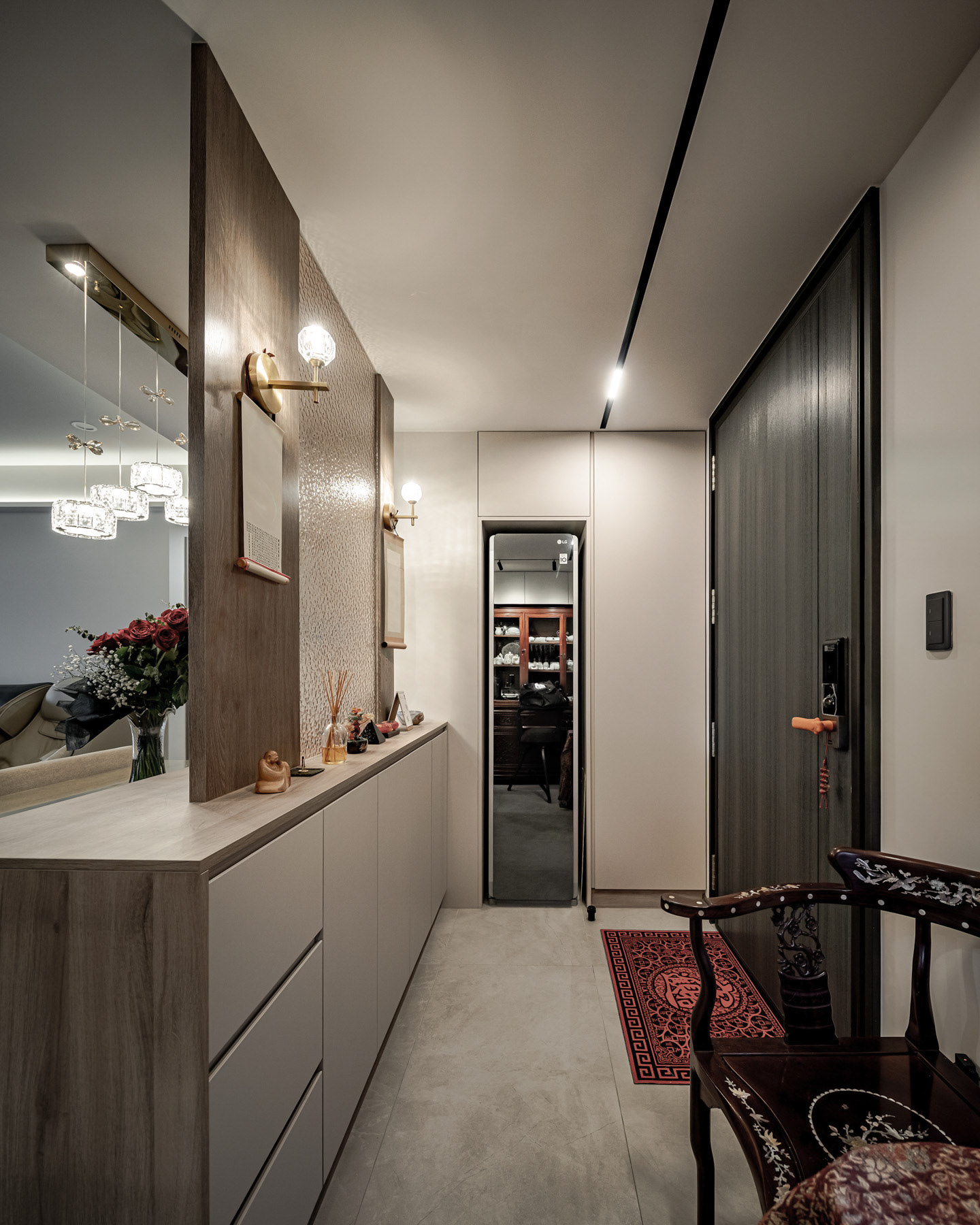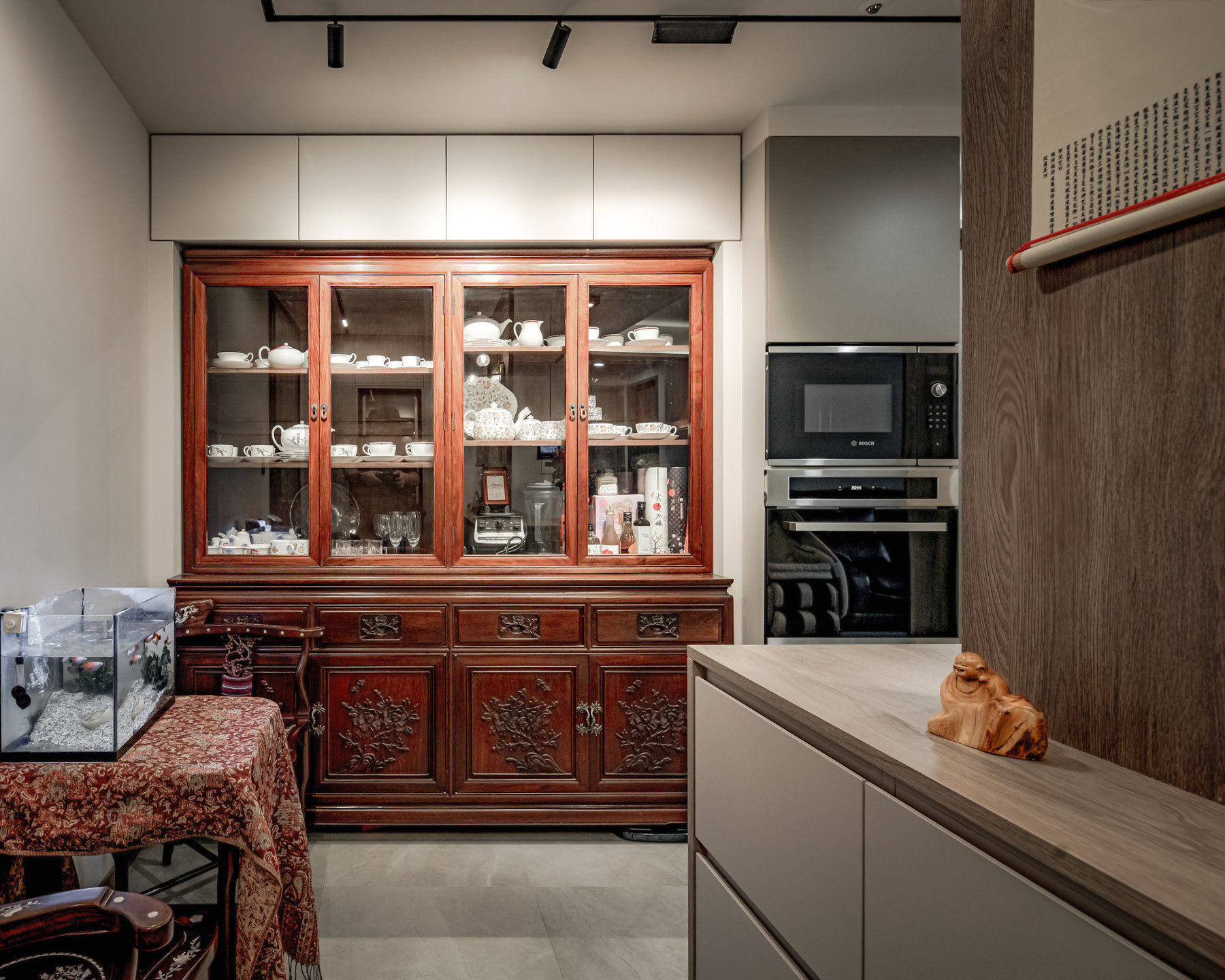 💎 舊物新生紅花梨木櫃:面對具年代感且富有家庭情感的紅花梨木櫃,以「新舊融合」為題,置於玄關進入客廳的過道,在木櫃上方設置了現代簡約的上櫃收納,並搭配策略性的投射燈聚焦照明。透過光線的柔和引導,讓這件珍貴的舊物重獲新生,優雅地融入空間。